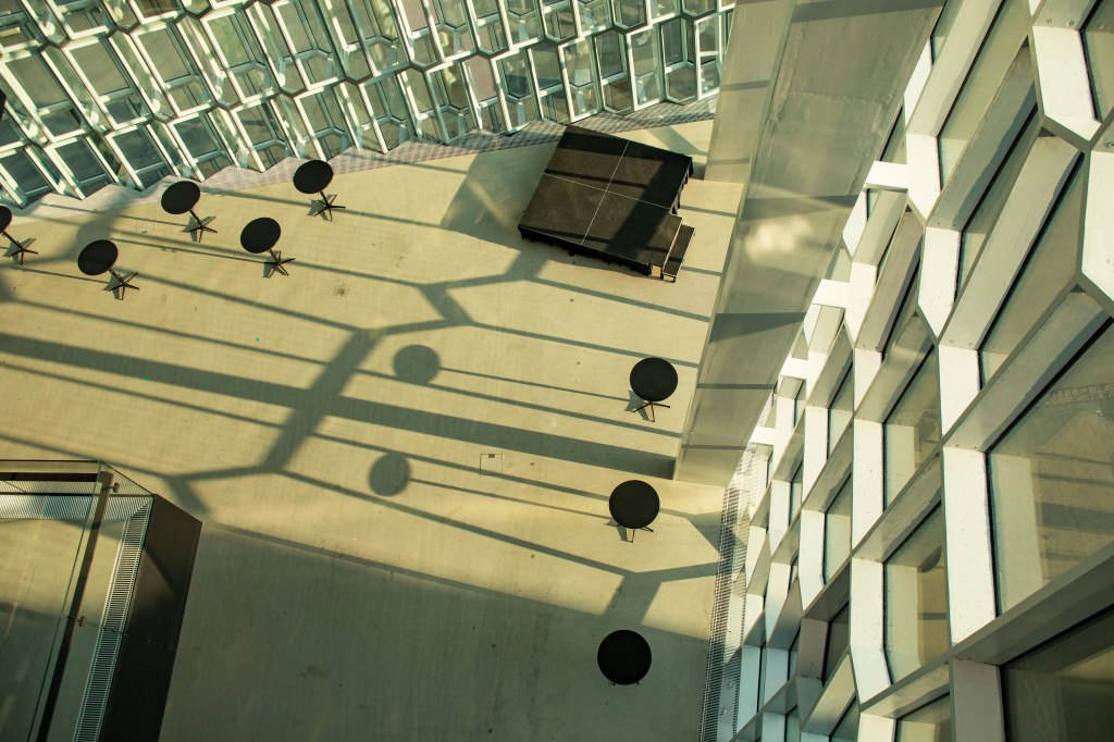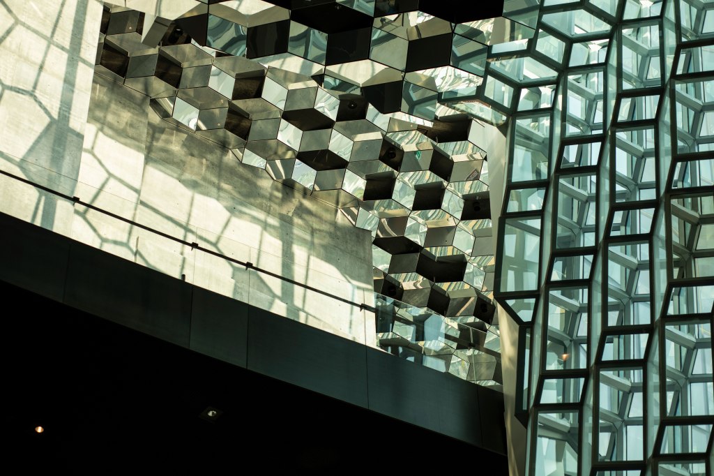 All’interno dell’edificio dell’Harpa, le strutture in vetro simili a un alveare riflettono la luce del sole sui pavimenti, creando geometrie sempre nuove da ogni angolazione.