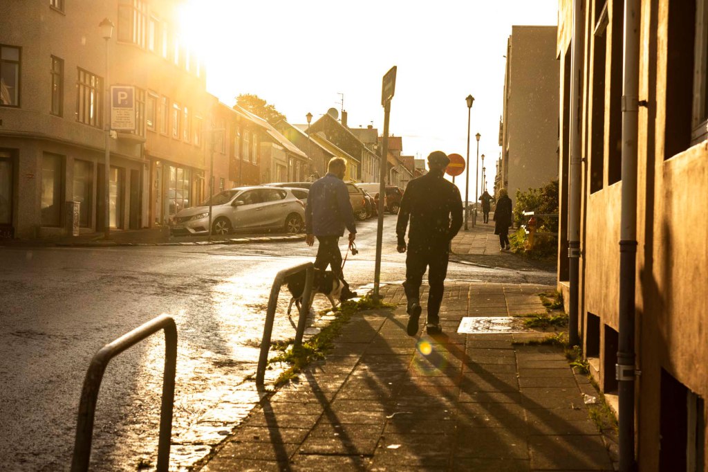 Si fa sera e il sole illumina in controluce le gocce di pioggia estiva. Passeggiamo tranquilli mescolandoci agli islandesi che, più lontani dalle vie turistiche, portano a spasso il cane o tornano verso casa con le borse della spesa. Il tramonto sembra non finire mai.