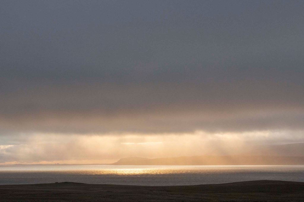 Riprendiamo la nostra rotta verso i fiordi del nord est. Il paesaggio si fa incredibilmente dolce: le terre si sbriciolano nell’oceano. Ogni tanto si intravede qualche fattoria o qualche chiesa, illuminata dalla luce calda del pomeriggio. I prati sono accarezzati dal vento, come in una danza.